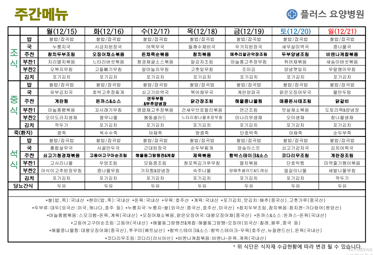 플러스요양병원 12월 셋째 주 주간메뉴