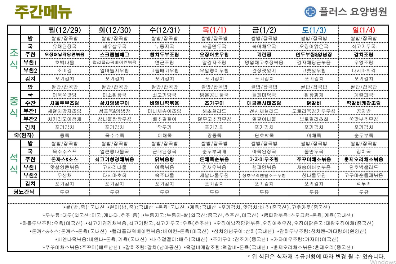플러스요양병원 12월 다섯째 주 주간메뉴