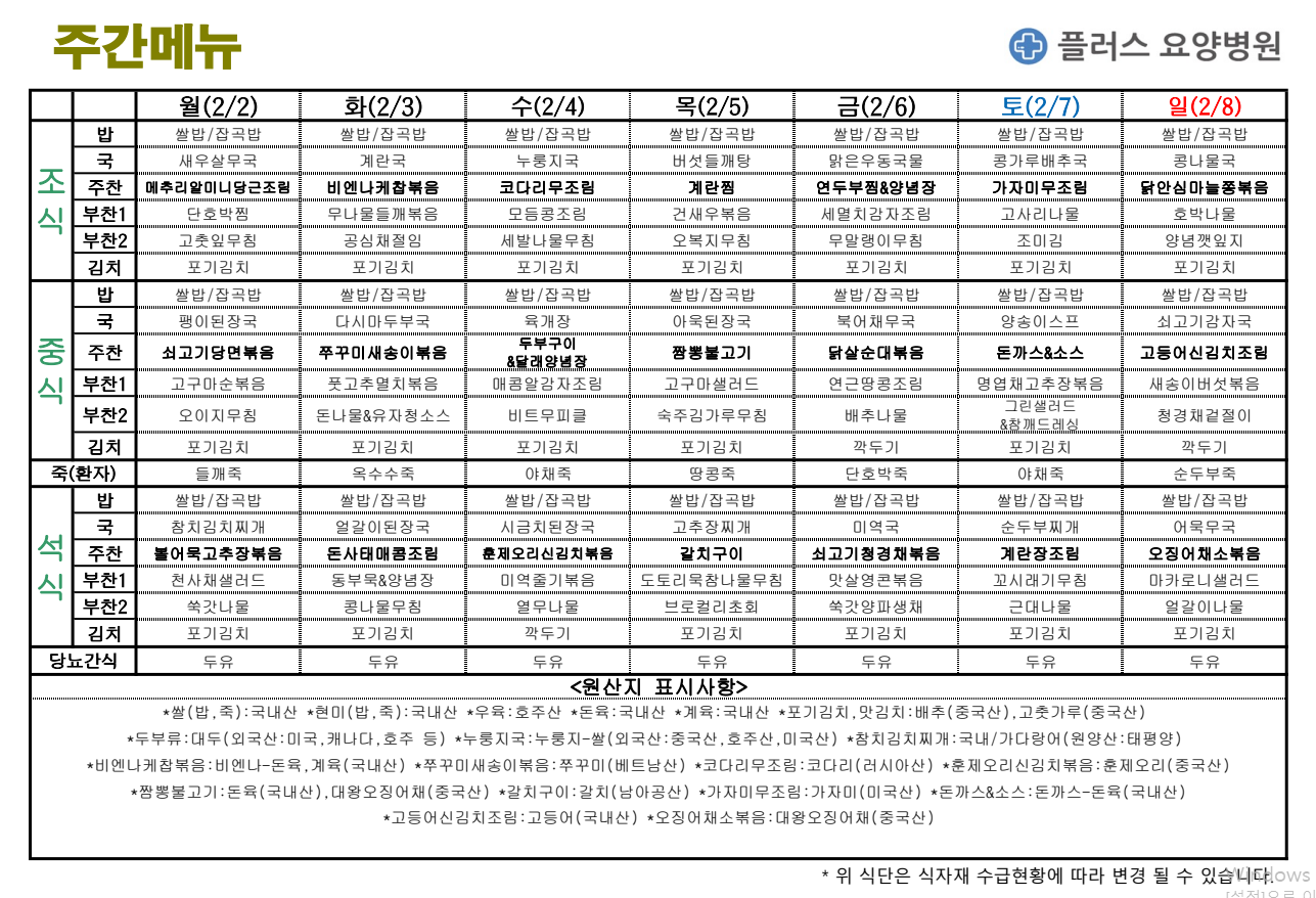 플러스요양병원 2월 첫째 주 주간메뉴