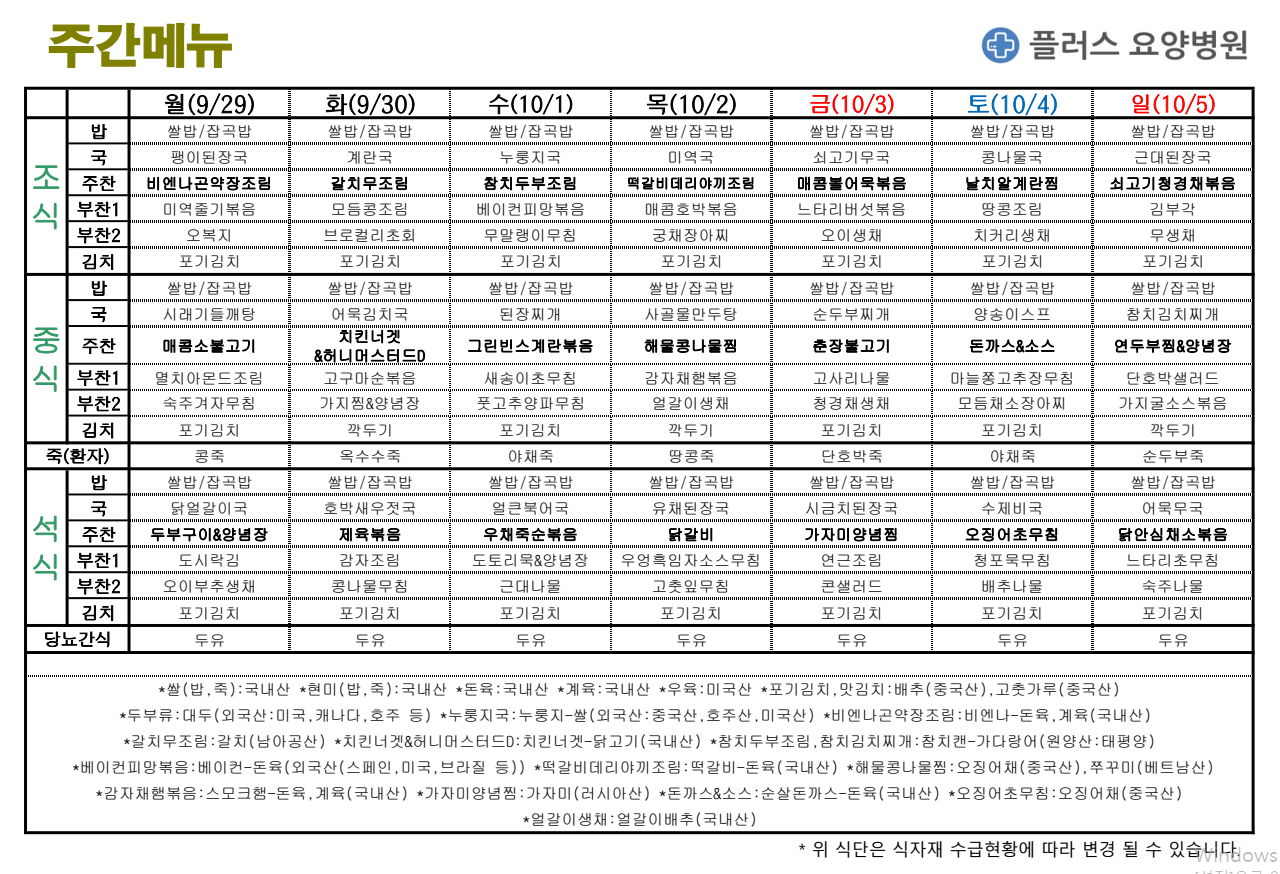 플러스요양병원 10월 첫째 주 주간메뉴